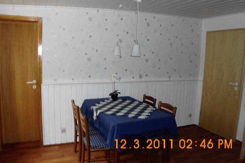 Kleiderschrank. Küche mit Einbauschränken, Tisch und 4 Stühlen.